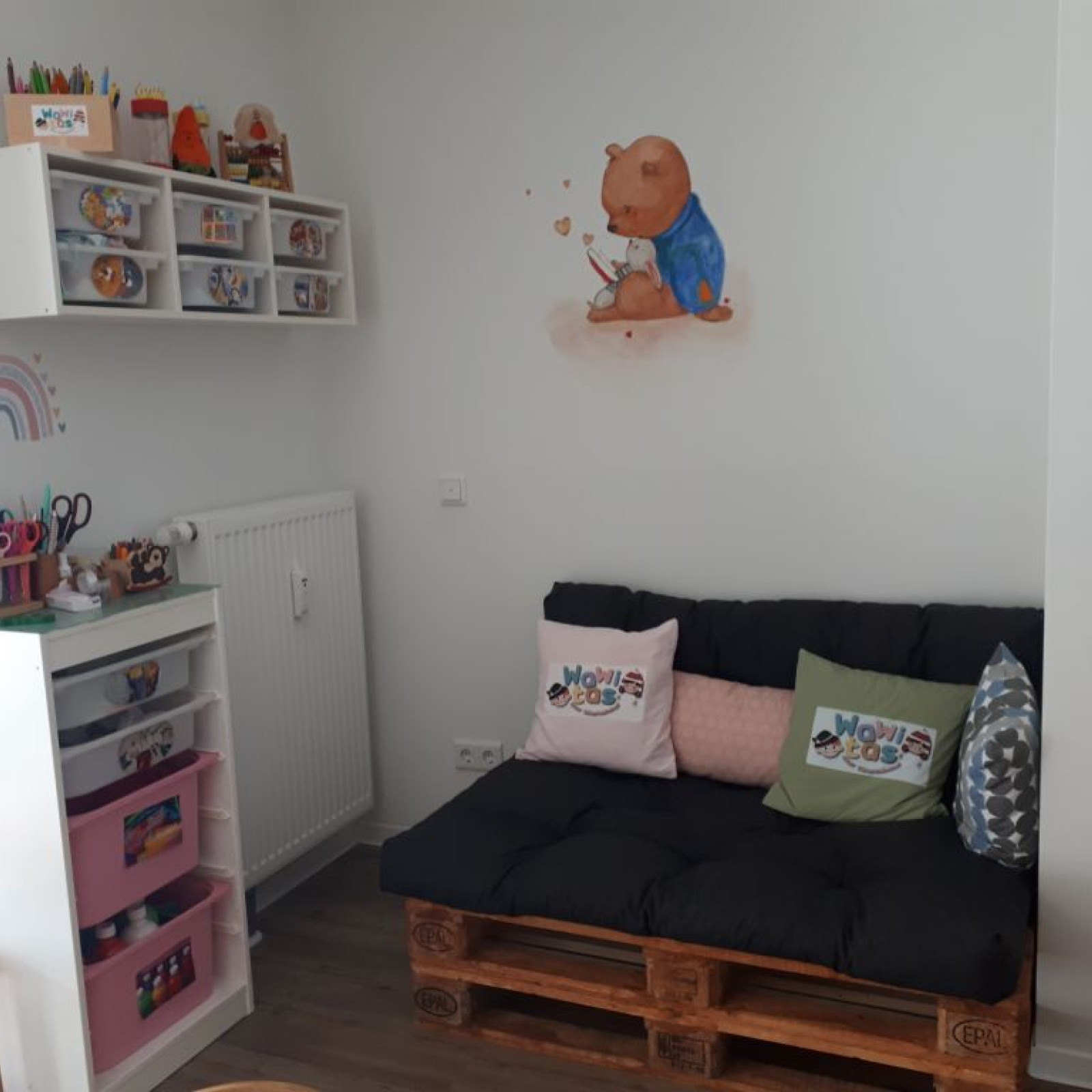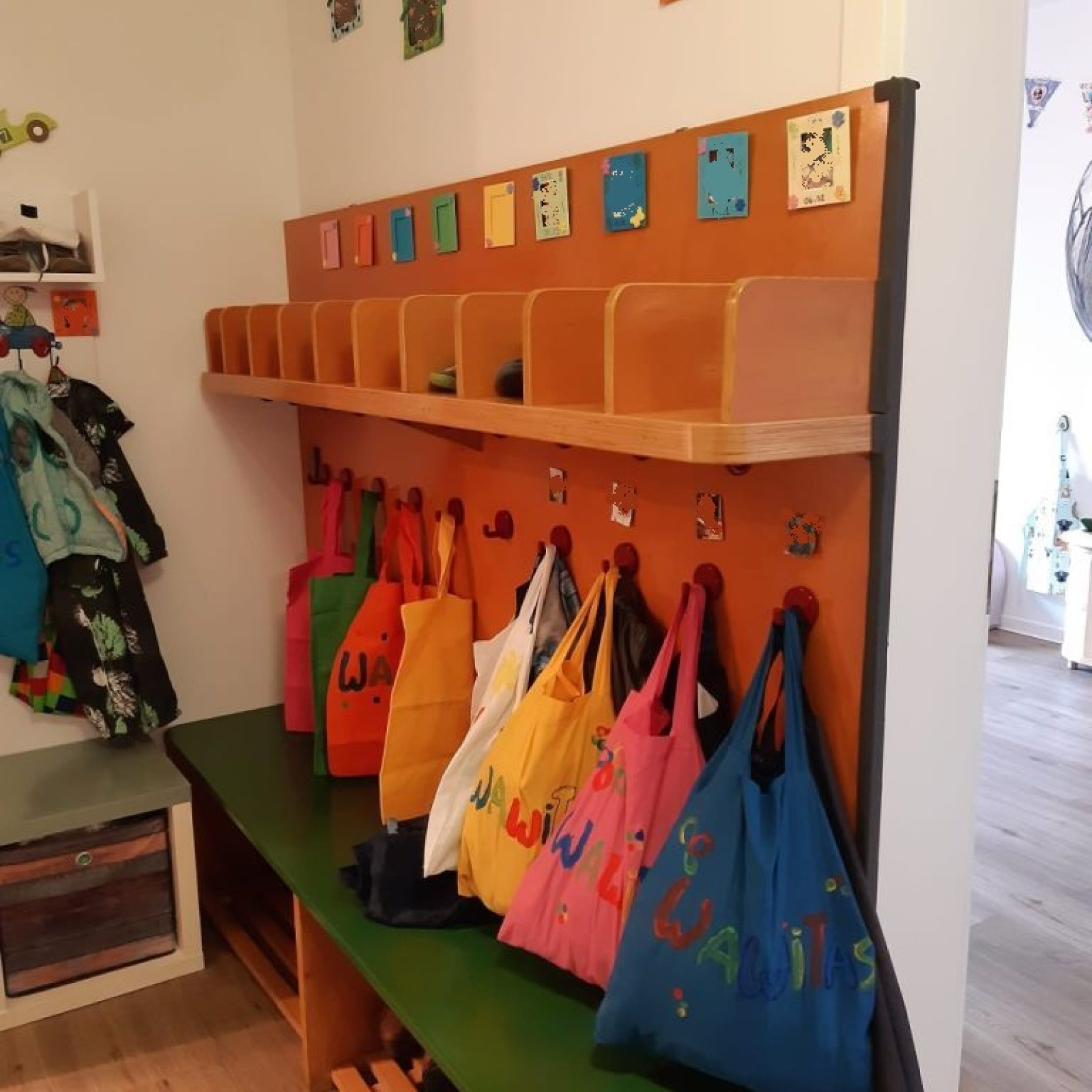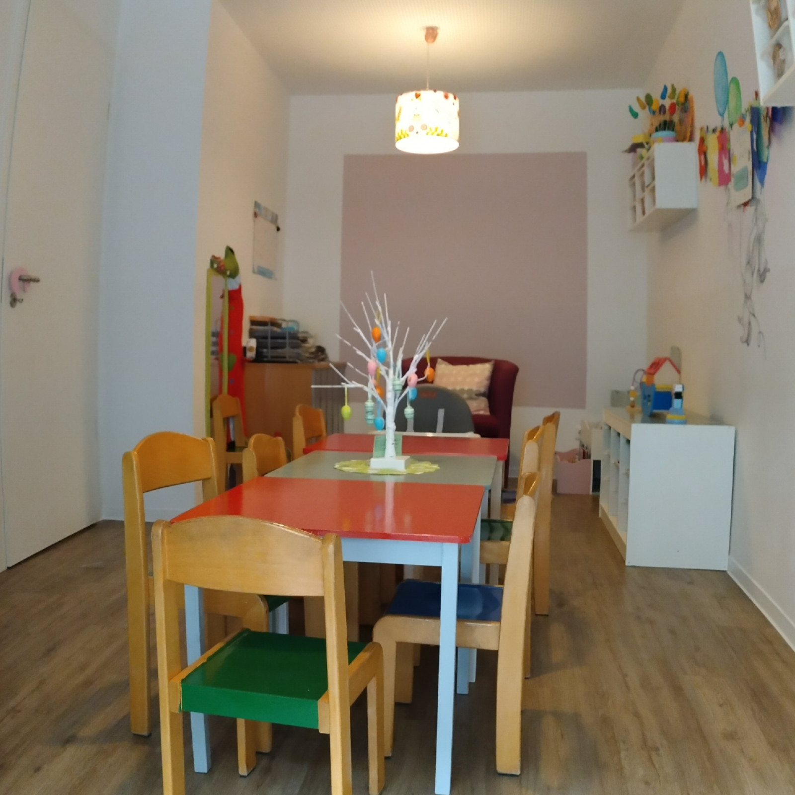 Kinder haben besondere Bedürfnisse an die Einrichtung: der Waschbereich hat einen Wickeltisch, niedrige Waschbecken und eine separate Toilette. Für den Mittagsschlaf oder um sich auszuruhen gibt es den Schlafbereich mit einer eigenen Matratze für jedes Kind. Die Küche ist besonders wichtig: hier bereiten wir die Mahlzeiten zu und lassen es uns zusammen am großen Tisch schmecken. In den Räumen gibt es verschiedene Bereiche zum Basteln oder Spielen – mache Bereiche werden auch für verschiedene Anlässe umgeräumt. In den Räumen wird natürlich nicht geraucht.
